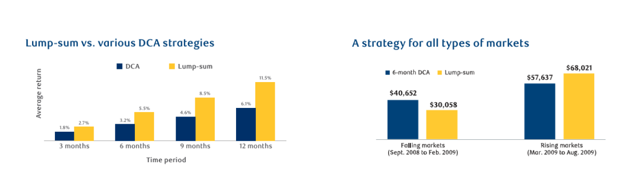 In the left chart, the comparison looks at two strategies: investing $10,000 all at once at the start of each period versus spreading the $10,000 evenly over monthly instalments. In every case, the lump-sum approach performed better. Since markets tend to rise over time, the DCA investor often ended up buying at higher average prices.