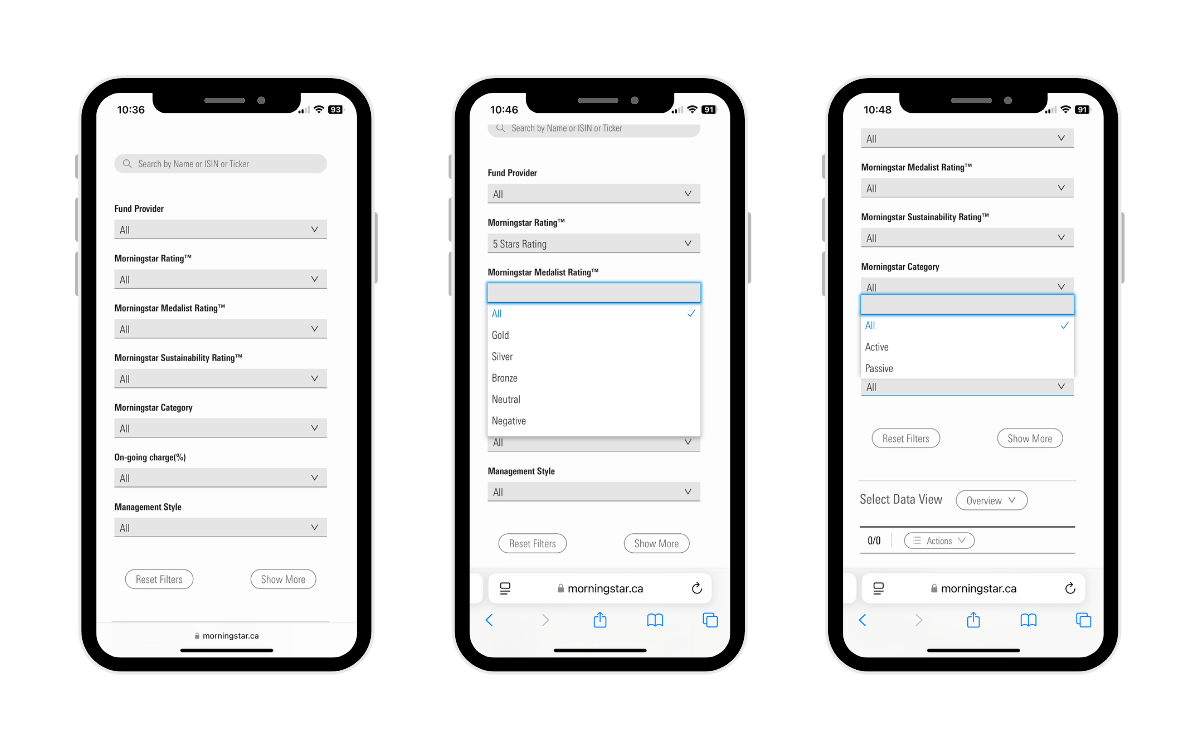If you’ve never done this before, you can use Morningstar Canada (which we'll use in our example). It's one of the most comprehensive sources for mutual fund research including ratings, category rankings, fees and risk analysis. You can filter by fund type, performance, fees and sustainability and it offers historical performance data, expense ratios and portfolio breakdowns.