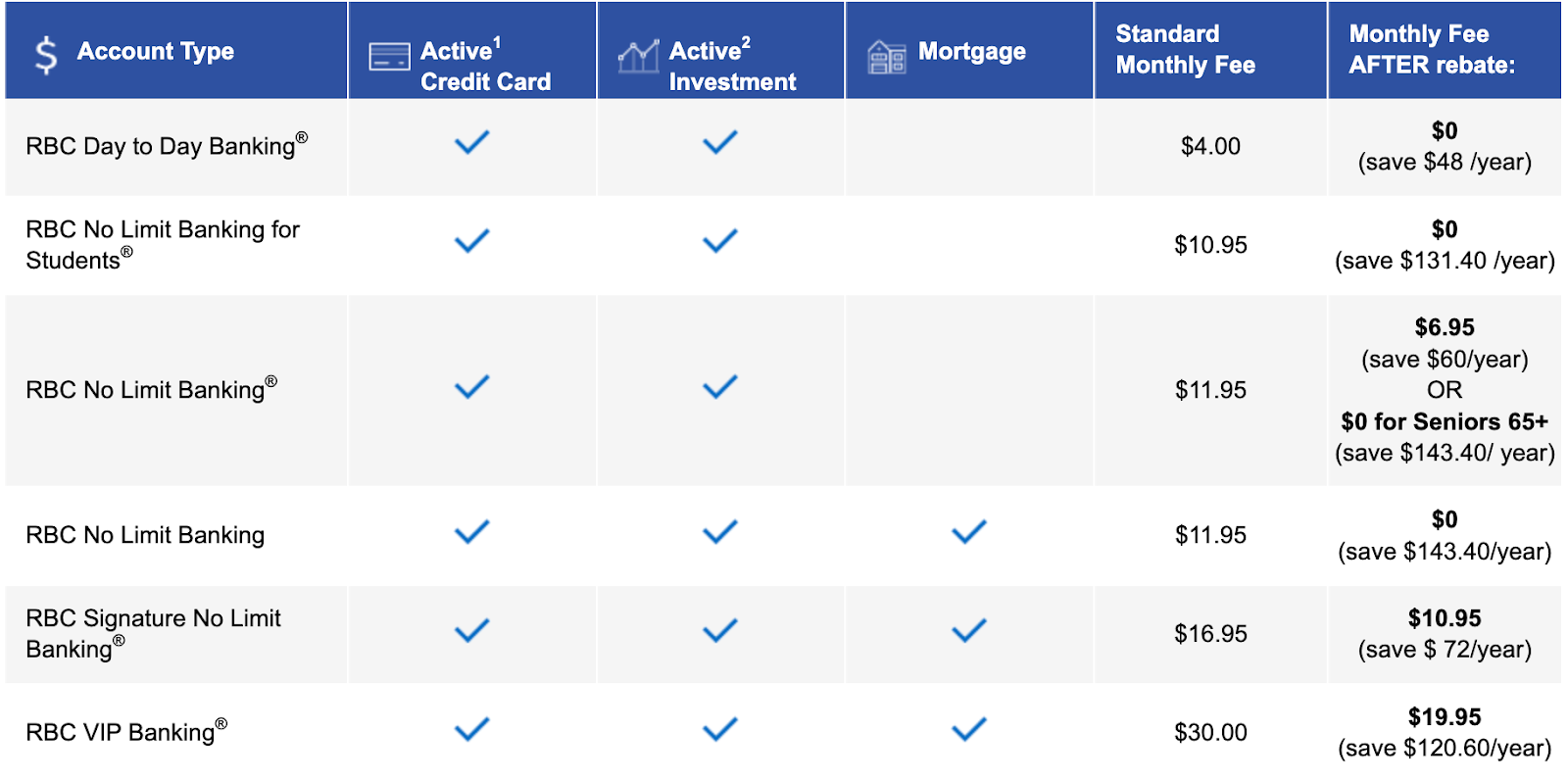 Before we break down each account, know that RBC offers MultiProduct rebates rather than “packages” like you’d find in Scotiabank’s Ultimate Package or TD’s All Inclusive Banking Plan.